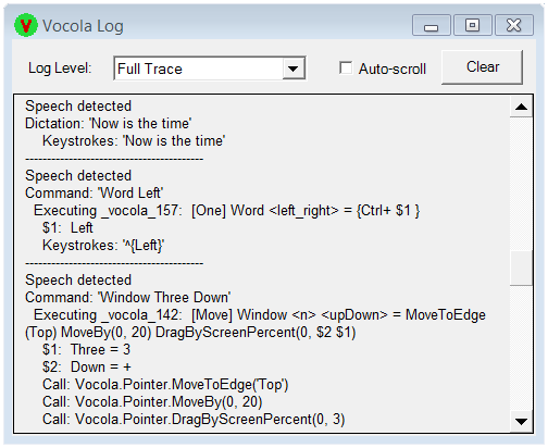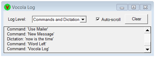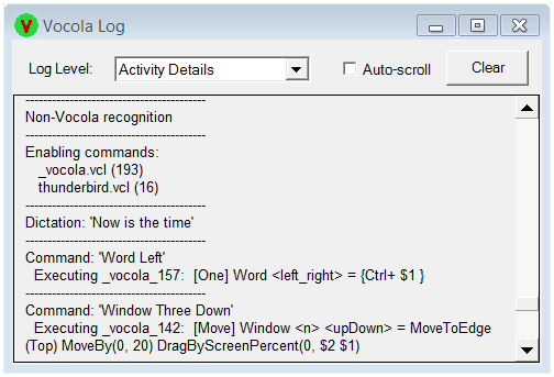 The Vocola log window shows information about Vocola activity, at a detail level specified by the "Log Level"