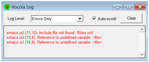 Errors Only is the default log level. An error message may appear because of a syntax mistake in a Vocola